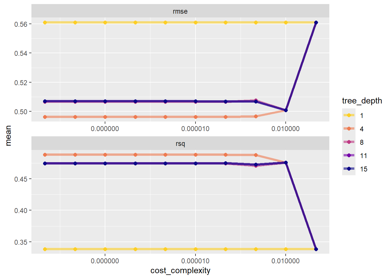 tree_depth: Tree Depth (type: integer, default: 30L)min_n: Minimal Node Size (type: integer, default: 2L)cost_complexity: Cost-Complexity Parameter (type: double, default: 0.01)If we want to use CV to choose one of these, we can set its value to tune() when creating the model. Let’s use tree_depth and cost_complexity as our tuning parameters and set our min_n to 20.