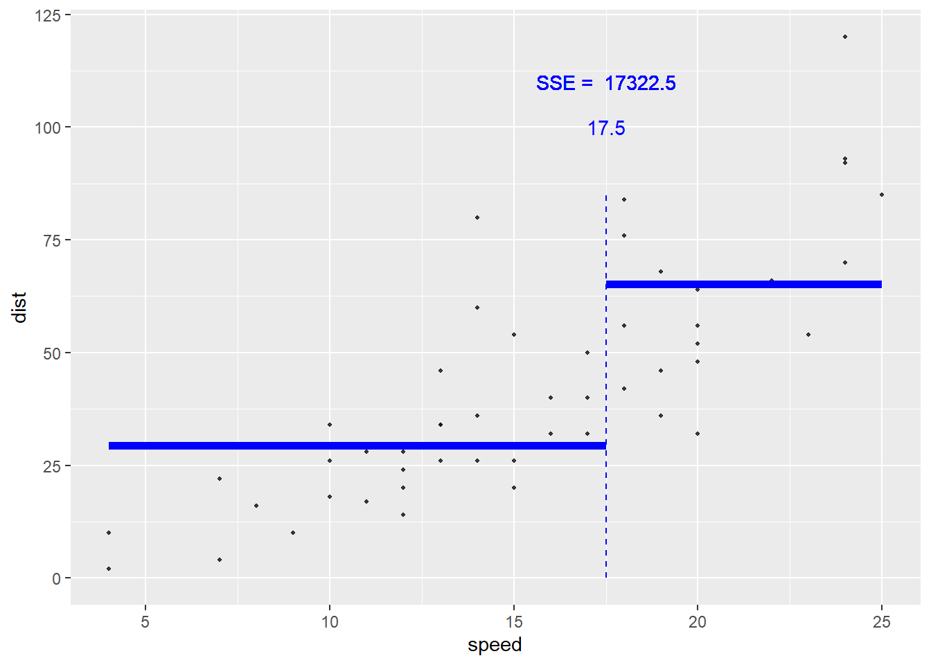 Let’s first try a split at speed = 7. The sum of squared errors based on this split is 2.766546^{4}.